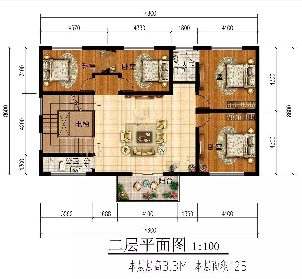 二層:客廳連通陽臺,家人可以在此喝茶看書,陶冶情操;4個臥室,滿足家人居住需求。