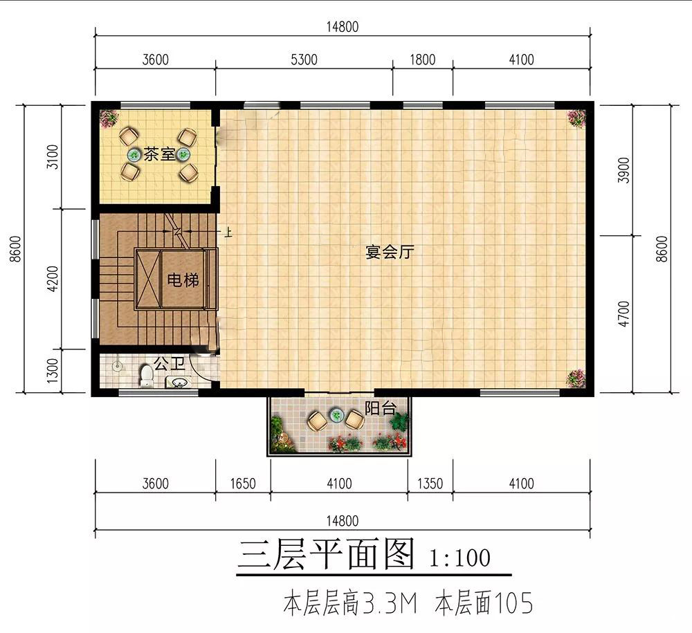 三層:空曠的宴會廳,可用來過年時,招待親友;設茶室,邀三兩好友在此下棋,打牌,舒適愜意。