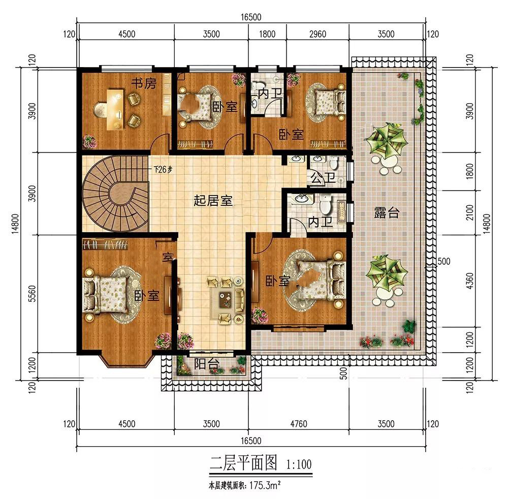 二層:小客廳連通陽臺(tái),增強(qiáng)室內(nèi)采光;4個(gè)臥室3個(gè)衛(wèi)生間,居住便利舒適;安靜的書房,方便家人辦公寫作,不會(huì)被打擾;大大的露臺(tái),觀景效果極佳,也方便衣物晾曬