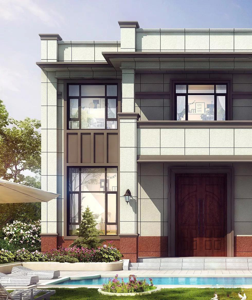 別墅外墻主體用仿大理石瓷磚裝飾,再用褐色真石漆裝飾墻角,用棕色真石漆裝飾門窗,別墅略顯莊重,體現(xiàn)別墅主人沉穩(wěn)性格。