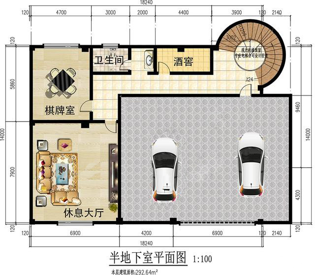 半地下室:休息大廳、棋牌室、酒窖、洗手間、車庫