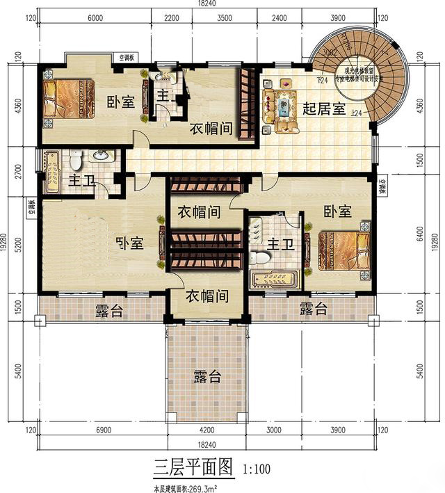 三層:起居室、3個臥室、衣帽間、3個洗手間、露臺