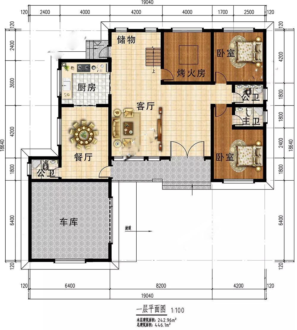 一層:入戶門廳過渡客廳,空間寬闊大氣;2個(gè)臥室和衛(wèi)生間,居住舒適便利;廚房餐廳設(shè)立在西側(cè),家人遠(yuǎn)離油煙干擾;設(shè)烤火房,家人圍坐在此烤火聊天,有利于增進(jìn)家人情感。