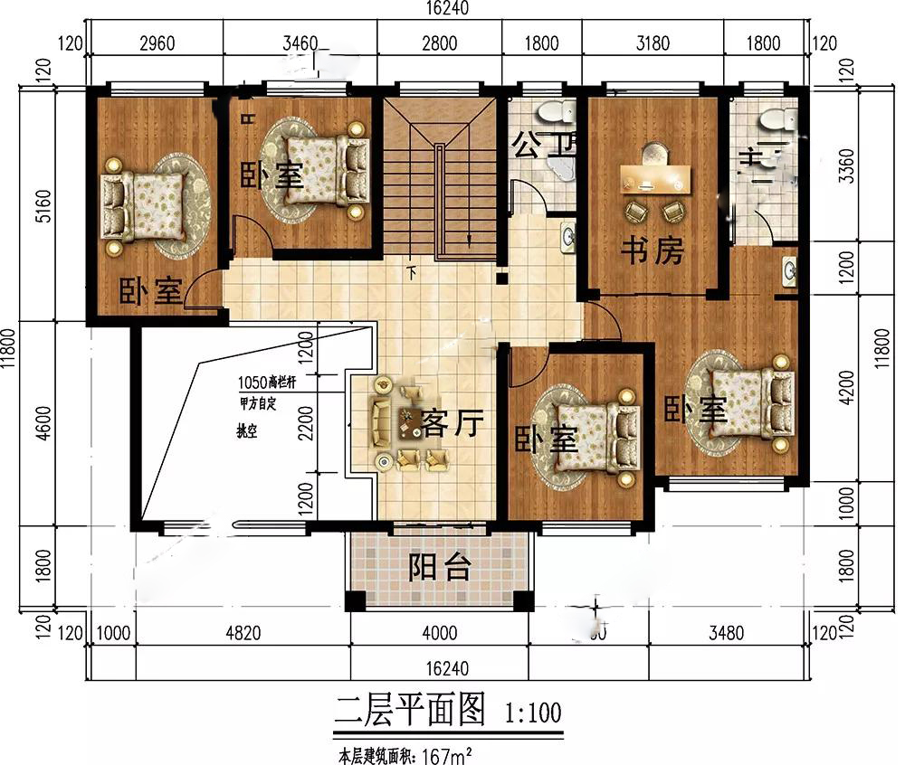二層:挑空客廳,開闊視野,連通小陽臺,為室內(nèi)帶來良好的采光;4個臥室,1個套房設(shè)計,帶有書房,休息辦公不被打擾