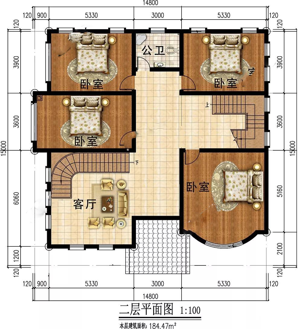 二層:客廳寬闊,方便家人在此談心,促進(jìn)感情;4個(gè)臥室,溫暖舒適,居住充裕。