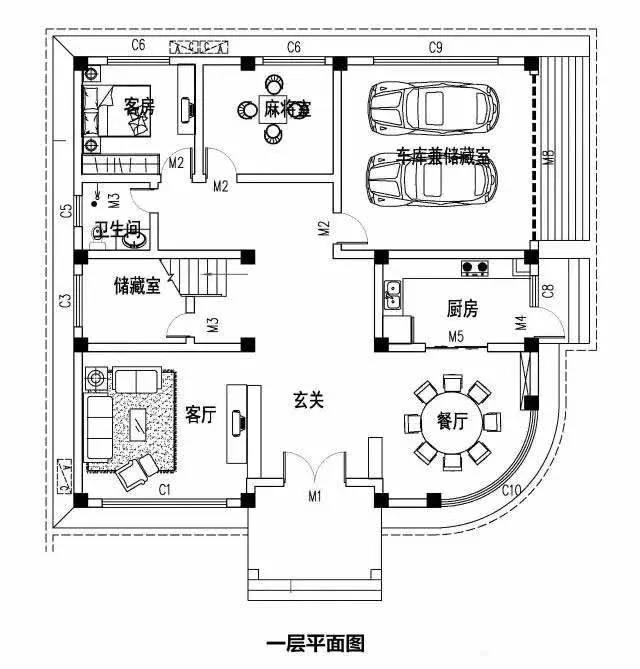 一 層:客廳、麻將室、客房、廚房、餐廳、衛(wèi)生間、儲藏室、車庫