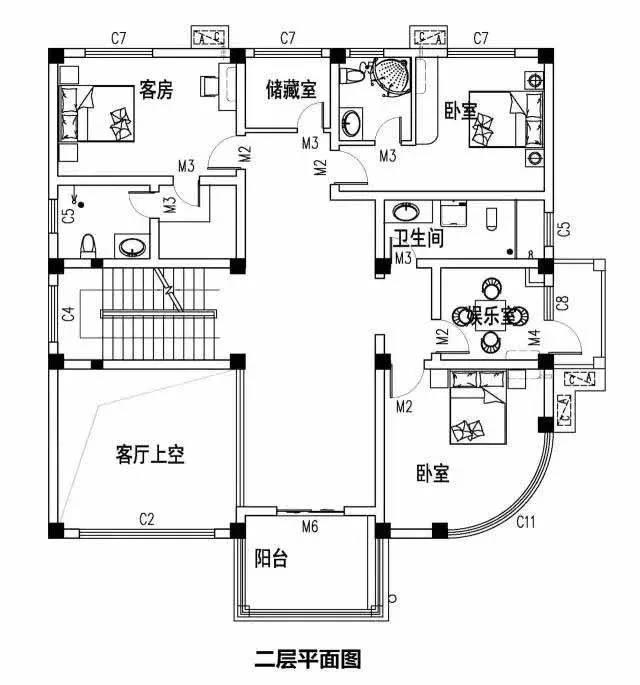 二 層:起居室(附陽臺)、2臥室(衛(wèi)生間)、臥室、娛樂室(附陽臺)、衛(wèi)生間