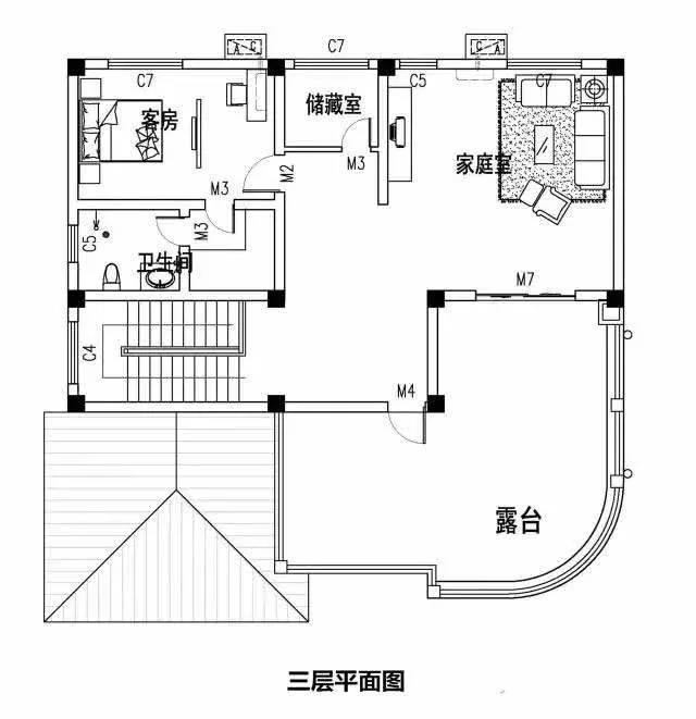三 層:家庭室、儲藏室、臥室(附衛(wèi)生間)、露臺
