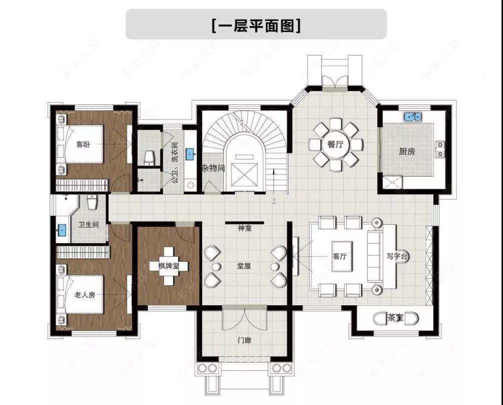 一層:門廊、堂屋、客廳、餐廳、廚房、棋牌室、老人房、臥室、衛(wèi)生間、雜物間??蛷d為挑空設(shè)計,也是近幾年非常流行的建造方式,富麗堂皇。