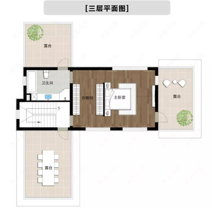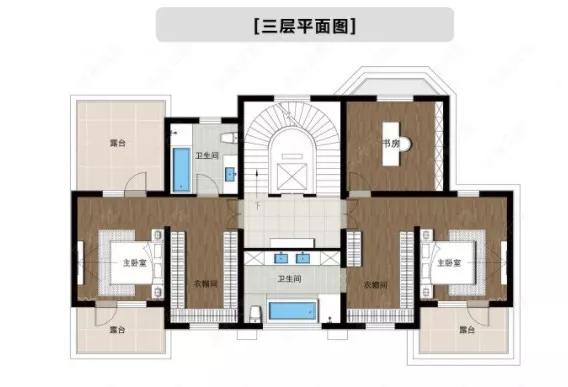 三層:2主臥套房(帶衣帽間和露臺)、書房、衛(wèi)生間、露臺。兩間臥室為套房設(shè)計,右邊的帶有書房,可作為主人房。