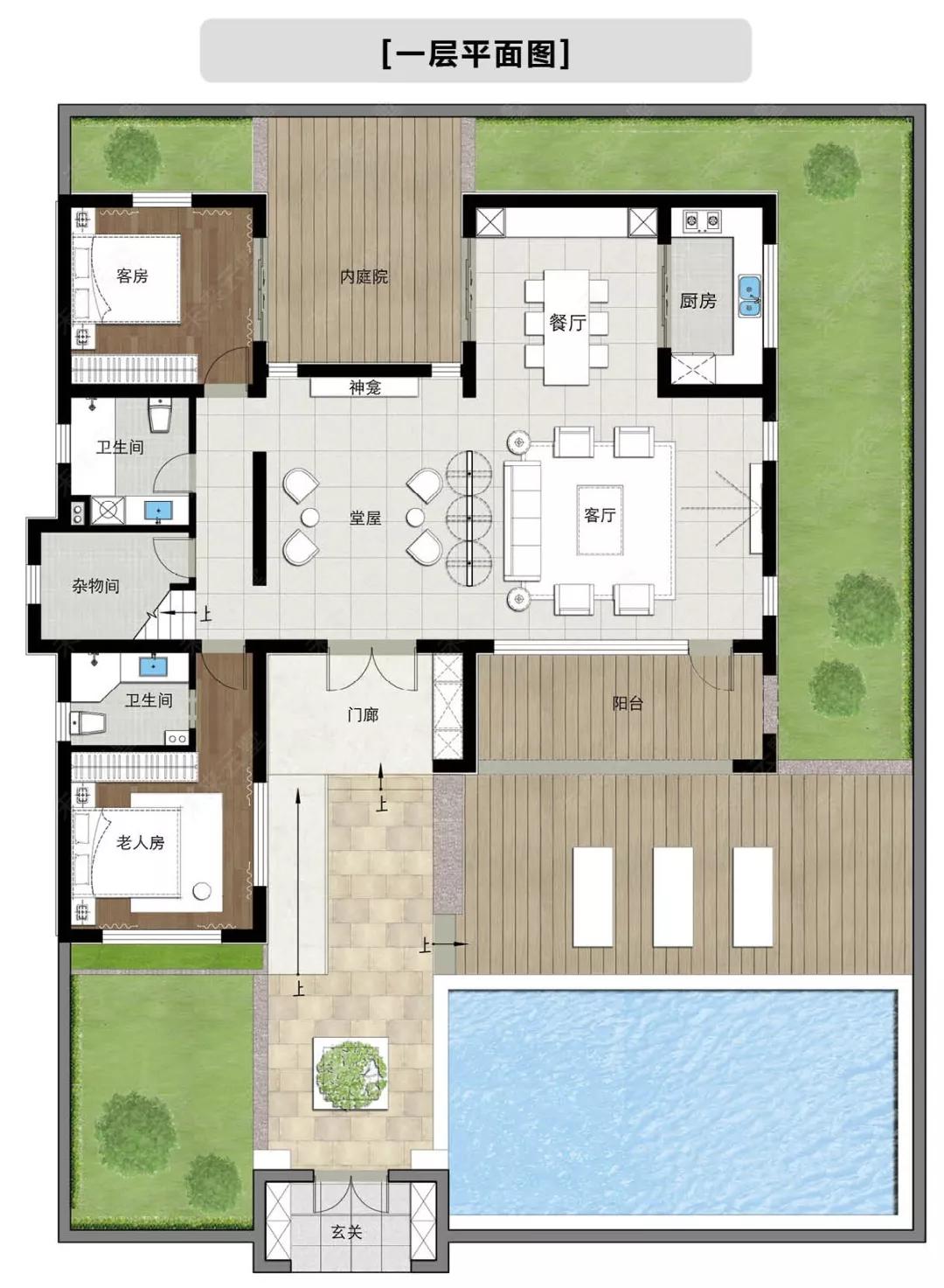 一層:門廊、堂屋、客廳、餐廳、廚房、客房、老人房、2衛(wèi)生間、雜物間、陽臺。