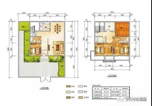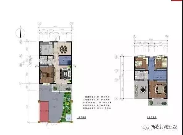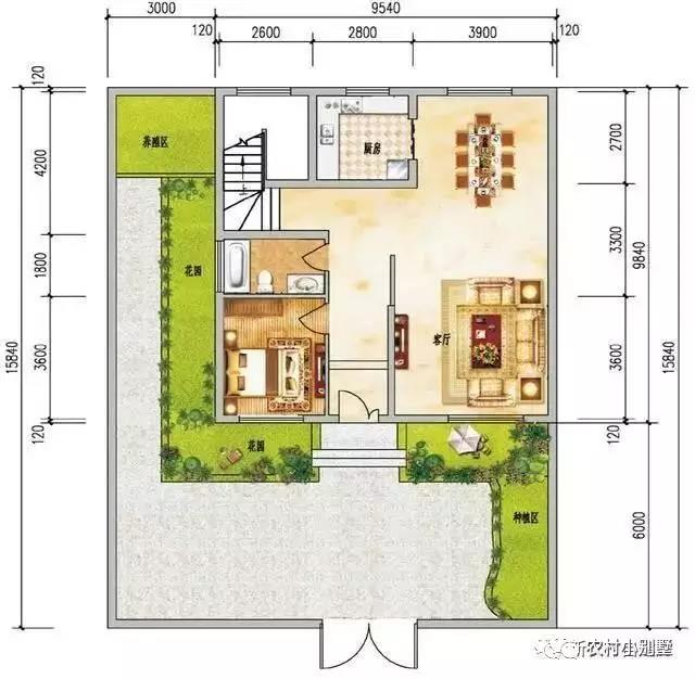 一層平面圖:進門有玄關(guān),右側(cè)南向為客廳,北側(cè)為餐廳,過年過節(jié)能擺好幾桌;餐廳和廚房相連,傳菜方便;西側(cè)南向為老人房,緊鄰衛(wèi)生間,起夜比較方便。前邊6米的庭院,可以綠化,也可以停放車輛。西側(cè)庭院3米寬,可以設(shè)置養(yǎng)殖區(qū),也可以綠化。