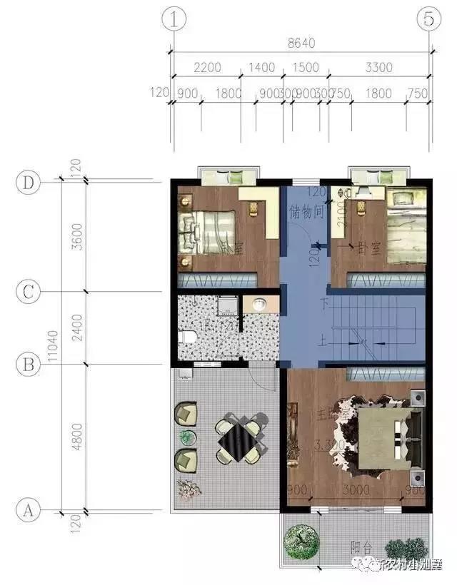 二層平面圖:兩件臥室全部朝南,主臥是帶衛(wèi)生間的套間。北側(cè)自西向東分別為樓梯,庫房和露臺。