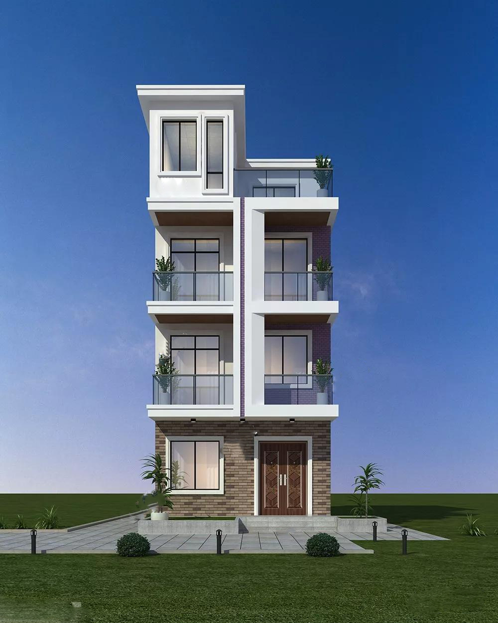 別墅外墻以白色真石漆為主,搭配棕色和紫色外墻磚,層次分明,設(shè)計(jì)感十足,多窗多露臺,觀景效果佳。
