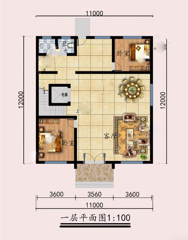 別墅一層平面圖:客廳、餐廳、2間臥室、衛(wèi)生間