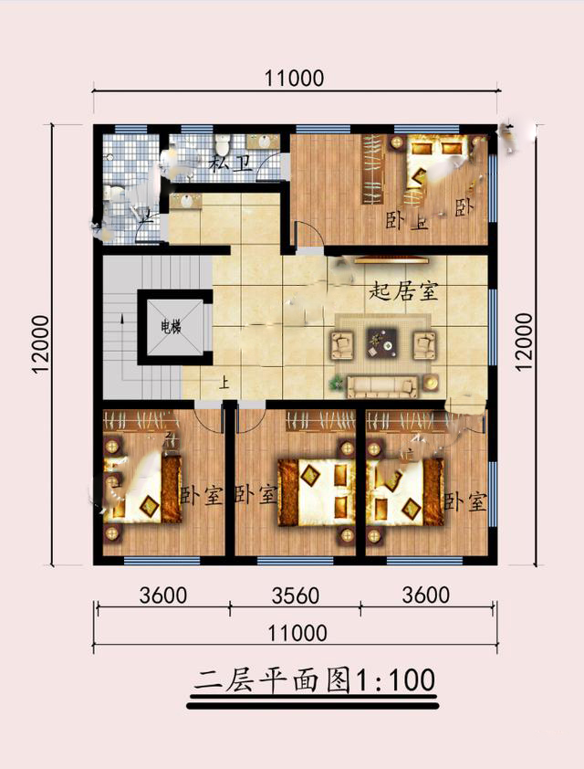 別墅二層平面圖:4間臥室、起居室、衛(wèi)生間