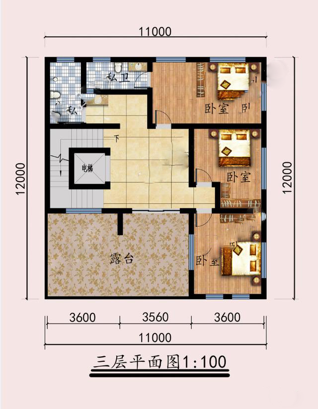 別墅三層平面圖:3間臥室、起居室、衛(wèi)生間、大露臺(tái)