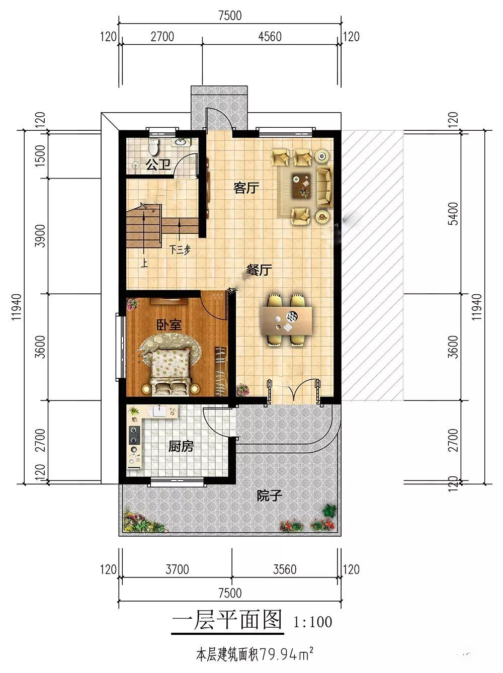一層:入戶設庭院,栽花種樹,夏天在院子里乘涼看星星;廚房在院子里單獨建造,隔離油煙。