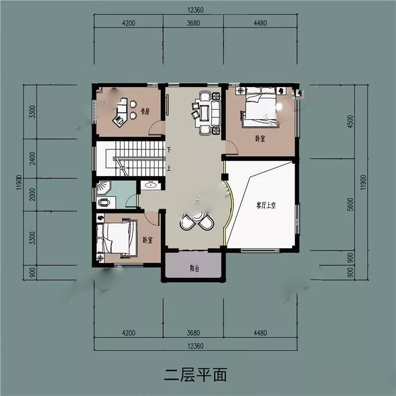 二層設(shè)有書房、客廳、臥室、陽臺(tái)、衛(wèi)生間
