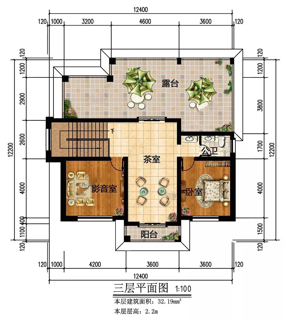 三層:影音室豐富家人的娛樂生活,看電影K歌;大露臺打造成空中花園,假山流水、花草蔬菜都可搬上來