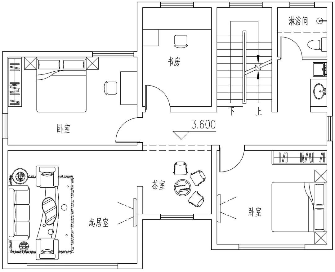 二層是生活起居的地方,西側(cè)設(shè)置書房便于辦公;茶室設(shè)置大面積窗戶,在增加待客休閑空間的同時,提升室內(nèi)的通透感