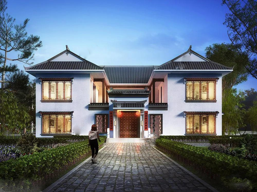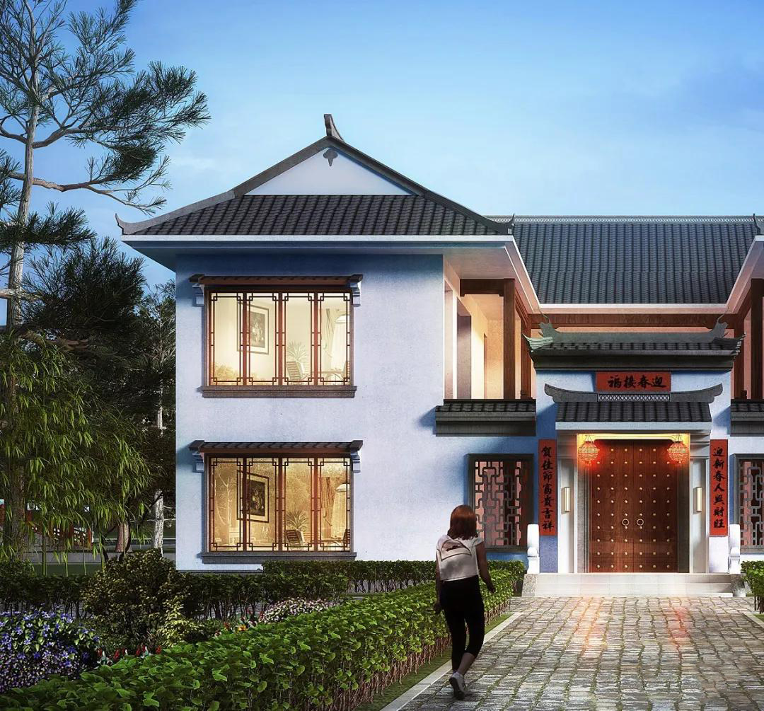 別墅屋頂采用灰色西班牙瓦,外墻用白色真石漆裝飾,灰色真石漆點(diǎn)綴門窗,鏤空雕花板圍墻,大門兩側(cè)燈籠和對(duì)聯(lián),中國風(fēng)十足。