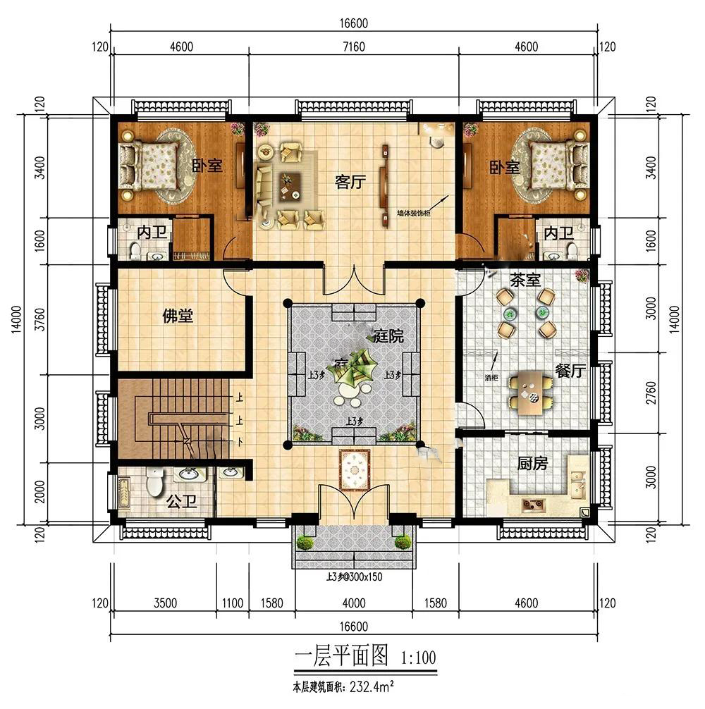 一層:入戶設(shè)庭院,種植風(fēng)水樹,種花養(yǎng)魚,提升家居風(fēng)水;室內(nèi)規(guī)劃合理,分區(qū)得當(dāng),生活井然有序,聚集家庭人氣。