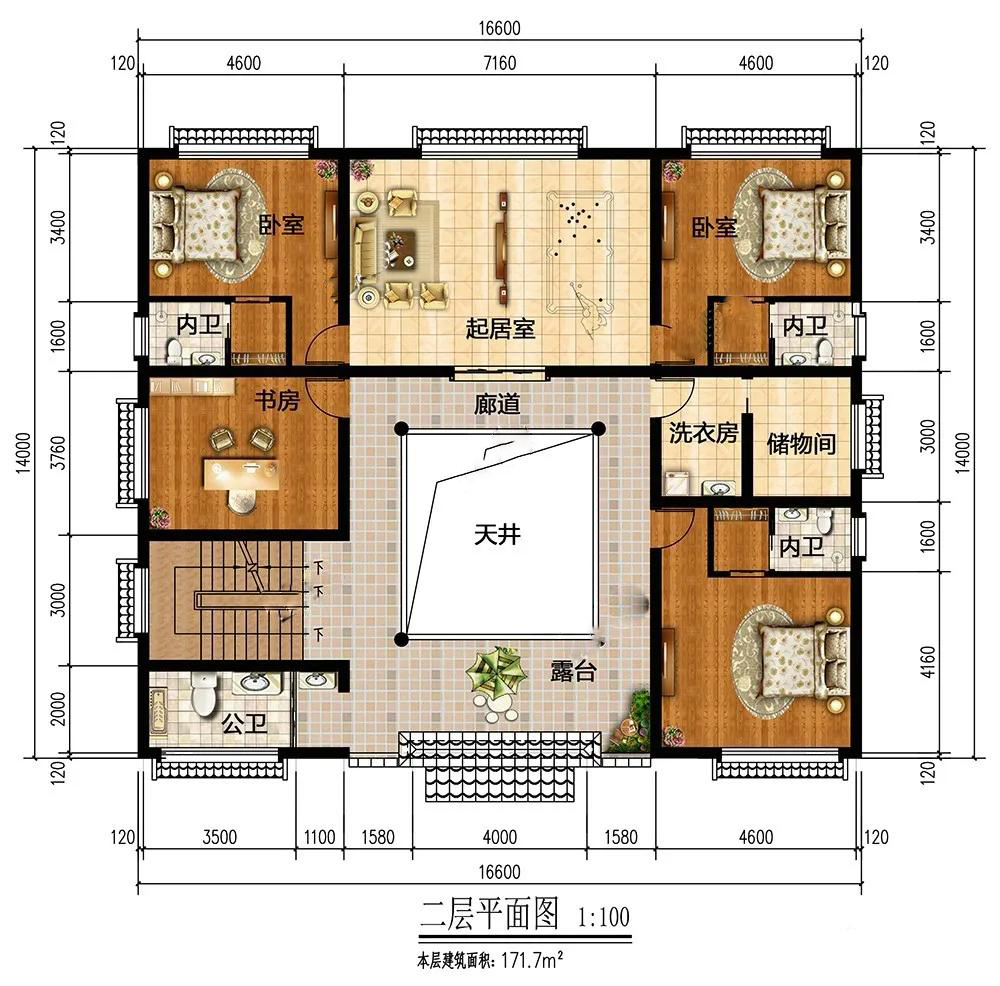 二層:天井上接天氣,下臨地氣,光線明亮,雨天雨水落入庭院,在風(fēng)水中是添財(cái)?shù)脑⒁?;臥室充裕,滿足起居;書房便于辦公讀書,提升書香氣息。
