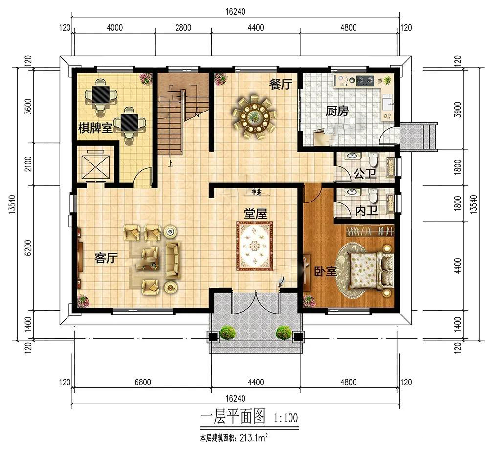一層:入戶設(shè)堂屋和神龕,符合農(nóng)村傳統(tǒng);客廳在前,聚集家庭人氣;廚房餐廳在后,還設(shè)側(cè)門進(jìn)出,干凈方便。
