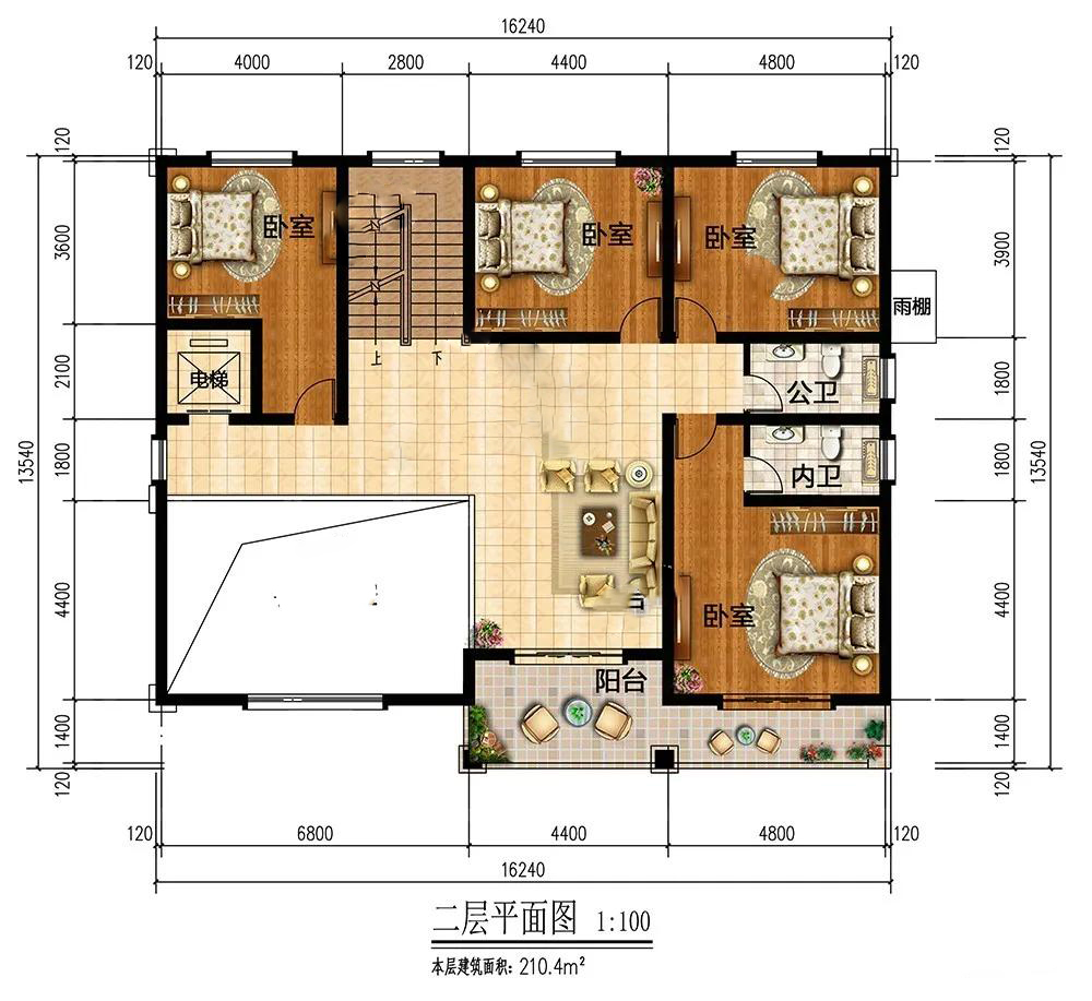 二層:設(shè)電梯,家中老人也方便上下;挑空客廳連通陽臺,視野開闊,通風(fēng)采光佳;4個臥室大小合理,滿足家人的日常起居。
