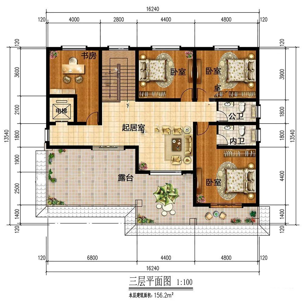 三層:臥室設(shè)置充裕,方便接待親朋好友來家中做客;書房安靜不被打擾,提升家居格調(diào);大露臺滿足晾曬,也可打造成空中花園