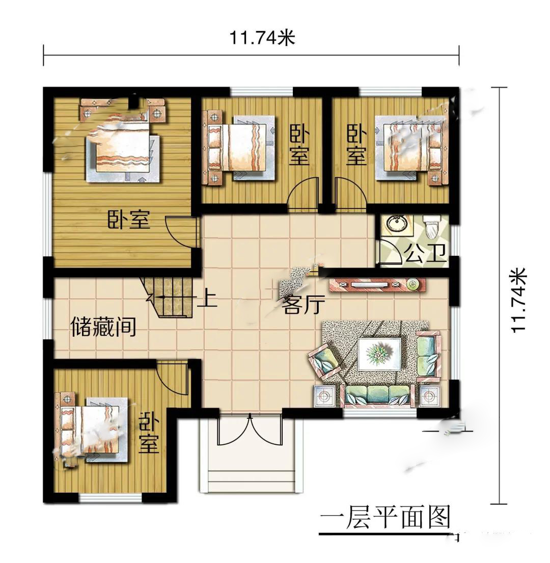 一層設(shè)有臥室、儲藏間、衛(wèi)生間、客廳