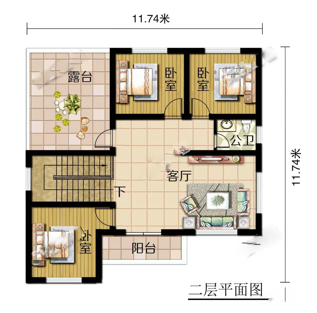 二層設(shè)有客廳、臥室、陽臺、衛(wèi)生間、大露臺