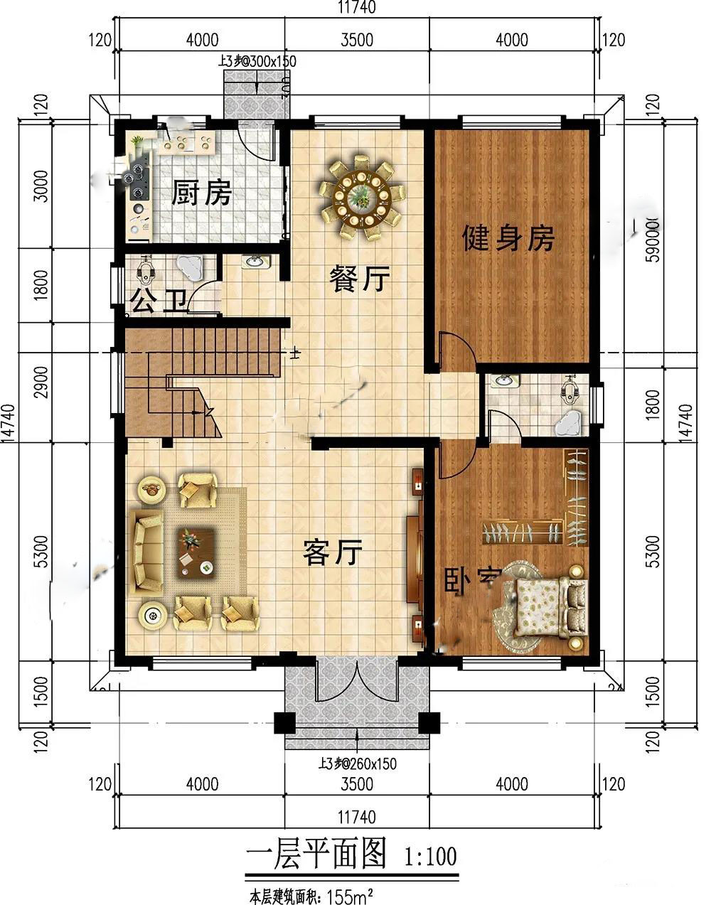 一層:客廳在前,聚集家庭人氣;廚房餐廳在后,還設(shè)后門,方便又清潔;健身房可以居家鍛煉,養(yǎng)成健康的生活習(xí)慣。