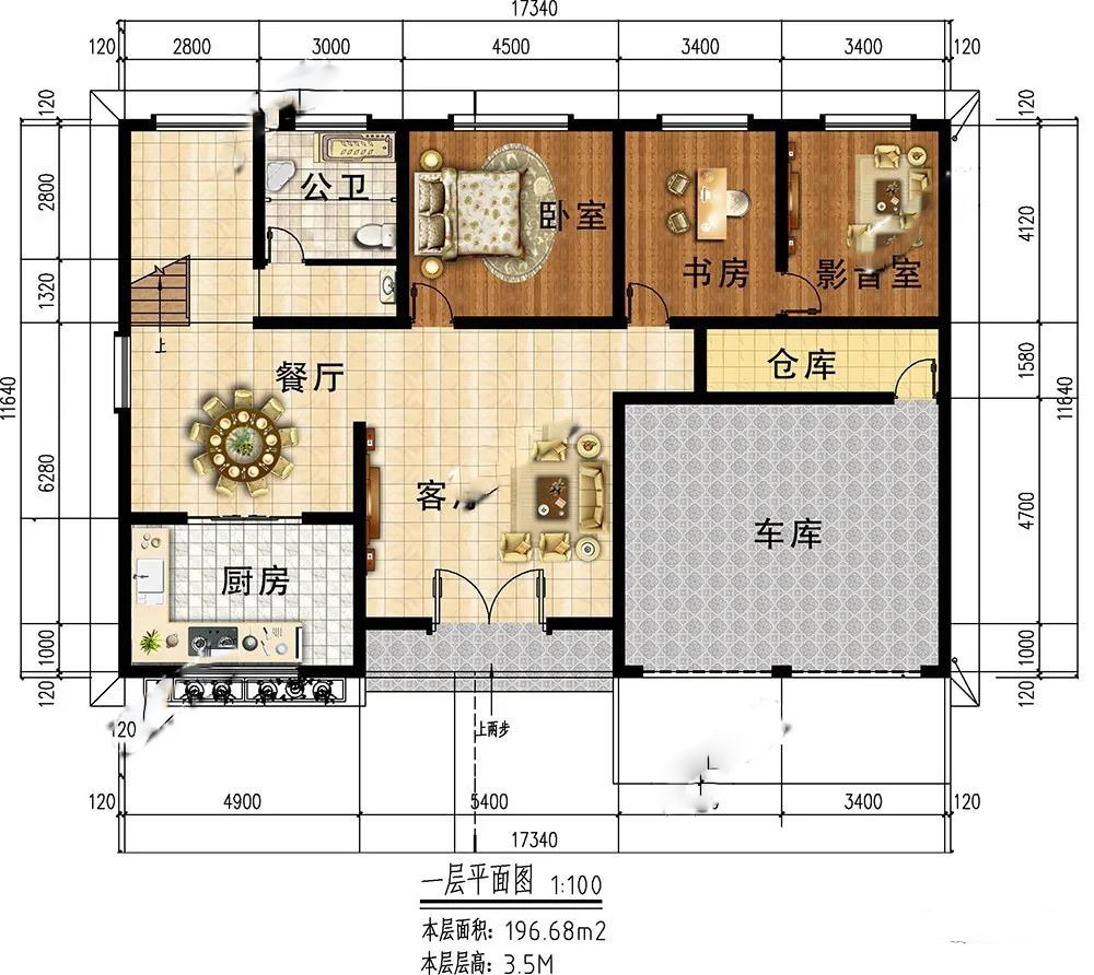 一層:設車庫,可停放2輛車,也可以做倉庫使用;書房和影音室設計,提升別墅檔次,豐富家庭生活。
