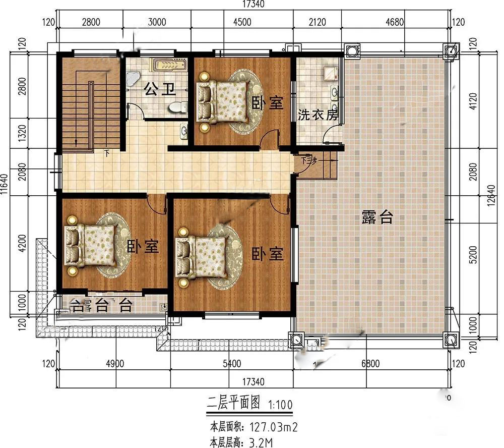 二層:3個臥室設置充裕,滿足全家人起居;洗衣房連通露臺,便于集中清洗大件衣物,方便晾曬。