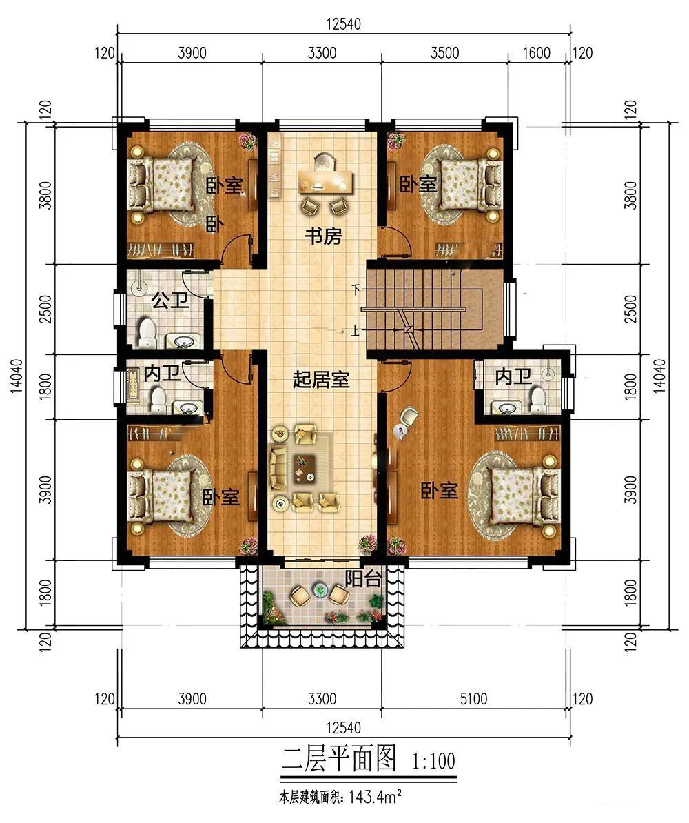 二層:4個臥室、3個衛(wèi)生間,配套充裕,滿足全家人起居;書房、起居室、陽臺一體化,家人熱鬧聚集在一起休閑娛樂。