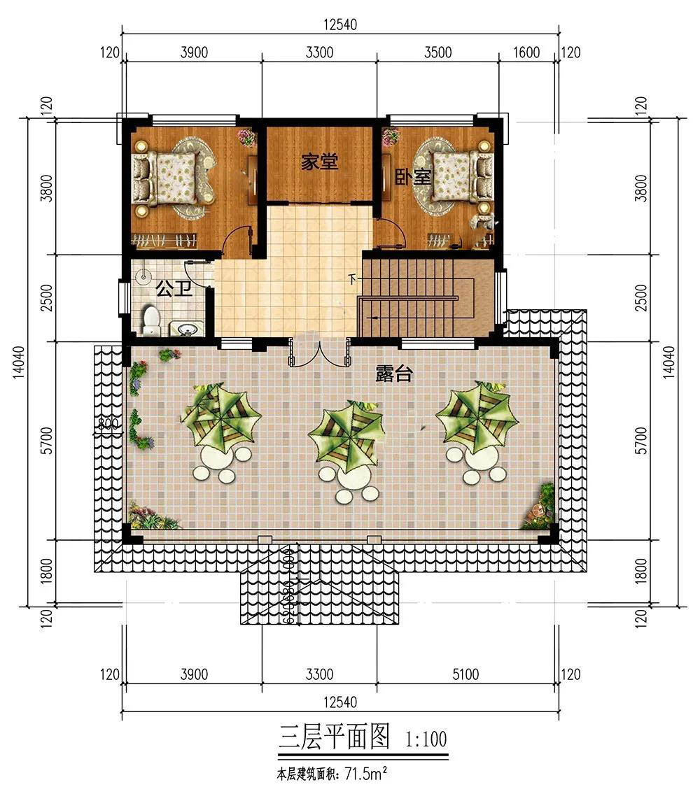三層:2個臥室,滿足家人起居后,可用于接待親朋好友;家堂用于禮佛誦經(jīng),修禪養(yǎng)心;大大的露臺,可打造假山流水,空中花園