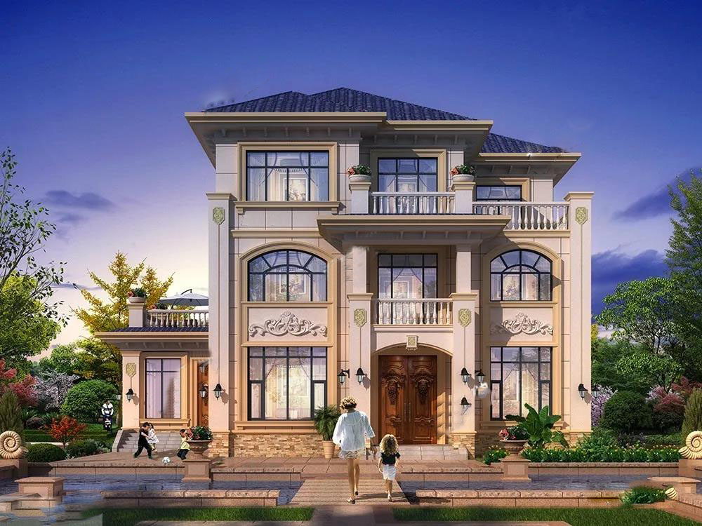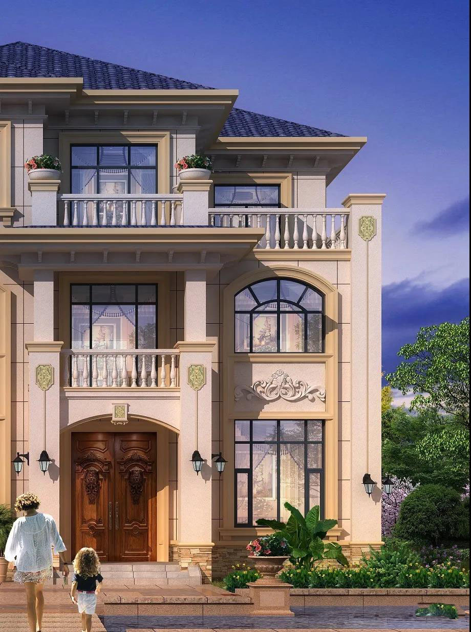 好了看看今天這款別墅吧。這款別墅為典型的歐式風格,外觀華麗上檔次,屋頂采用藍色西班牙瓦,外墻裝飾采用米黃色仿大理石真石漆,精致的山花、金色的門窗套點綴,氣派非凡。