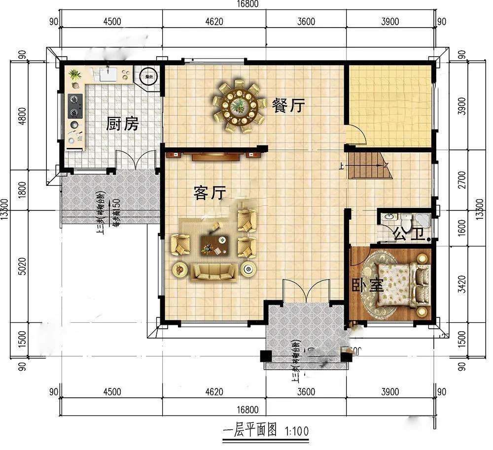 一層:入戶即是客廳,大氣開闊;廚房單獨設(shè)置一側(cè),潔污分區(qū),還設(shè)土灶,方便做柴火飯,保留農(nóng)村傳統(tǒng)。