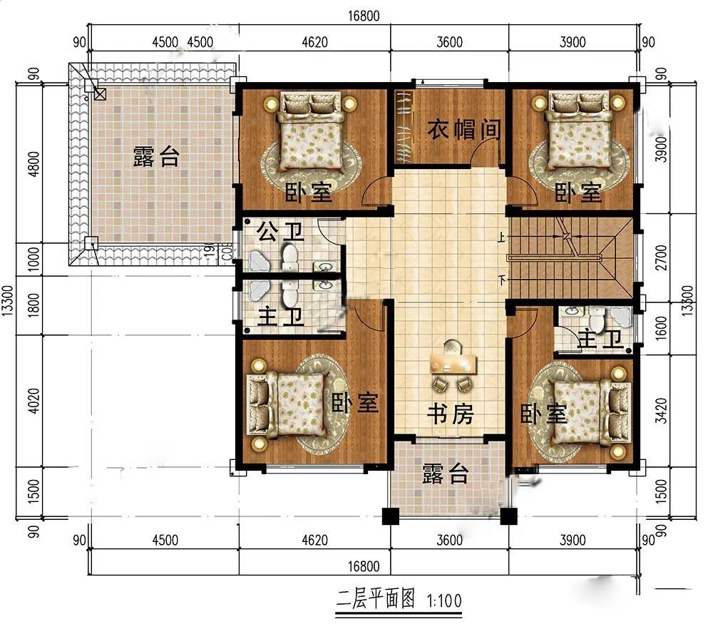 二層:4個臥室、3個衛(wèi)生間,配套完善,起居便利;開放式書房連通露臺,喝茶看書,賞窗外風景,悠然自得。