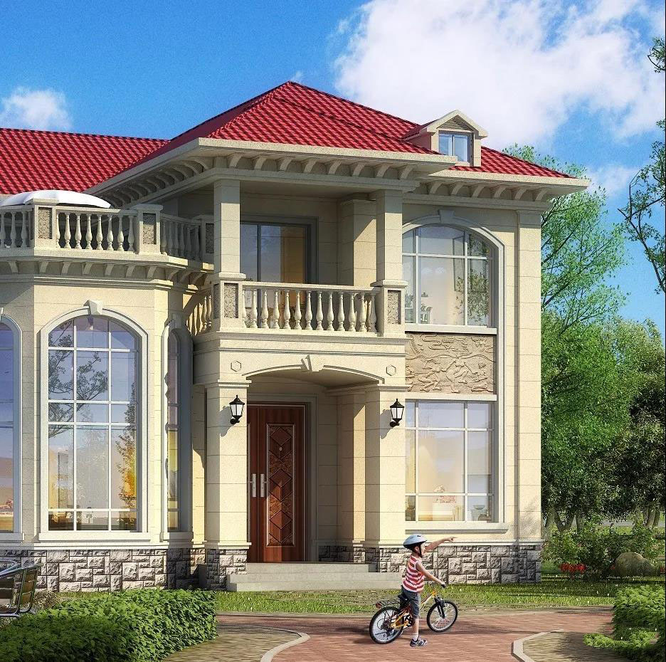 別墅屋頂采用紅色西班牙瓦,米黃色真石漆和淺灰色蘑菇石相搭配,咖啡色浮雕點綴墻面,配色清新淡雅,在鄉(xiāng)村何不失為一道靚麗的風景線?