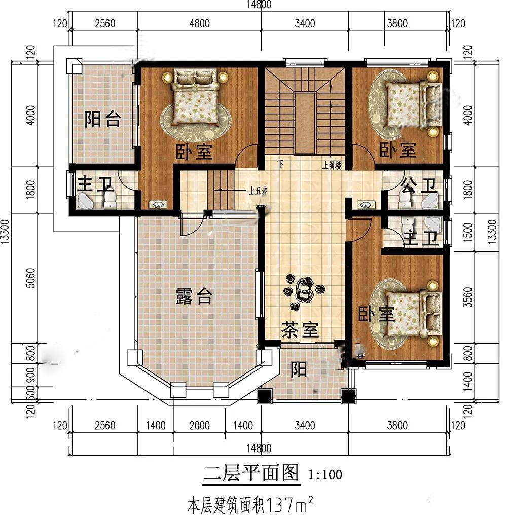二層:3個臥室、3個衛(wèi)生間,保護隱私,居住舒適;茶室和露臺相通,自然交互性好,親近自然