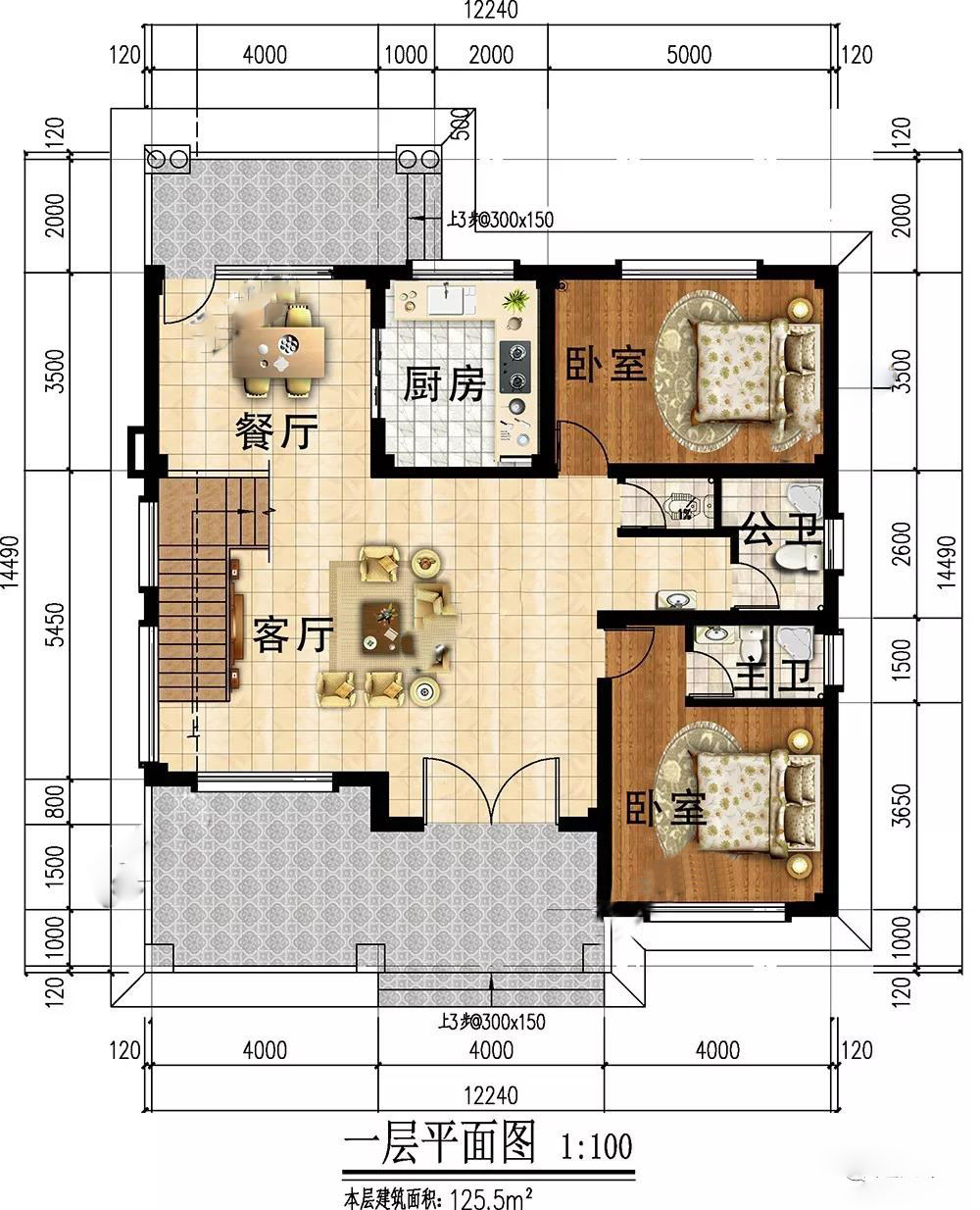 一層:入戶客廳開(kāi)闊,待客周到方便;2個(gè)臥室2個(gè)衛(wèi)生間,老人居住方便舒適;廚房餐廳在后,并設(shè)有后門(mén),用餐干凈衛(wèi)生。