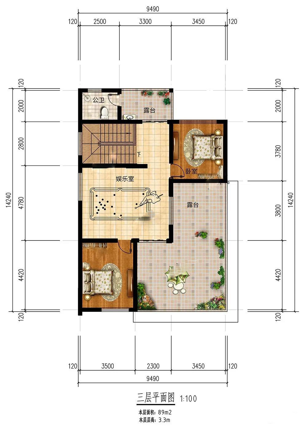 三層:臥室設(shè)置充裕,滿足家人居住外,還可招待親朋好友在家中做客留宿;娛樂室打打球,健健身,養(yǎng)成健康生活習(xí)慣