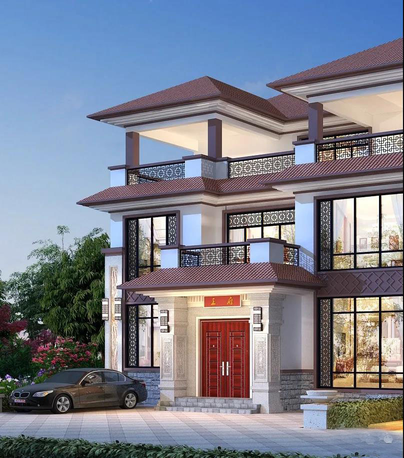 別墅屋頂是紅色西班牙瓦,米白色和褐色真石漆相搭配,精致鏤空窗花、圍欄,霸氣的浮雕點(diǎn)綴,貴氣逼人。