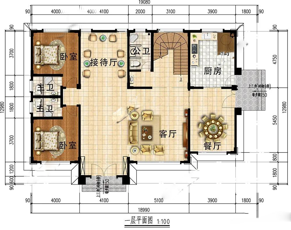 一層:別墅占地開(kāi)闊,整體動(dòng)靜分區(qū)、潔污分離;廚房餐廳設(shè)側(cè)門(mén),方便進(jìn)出。
