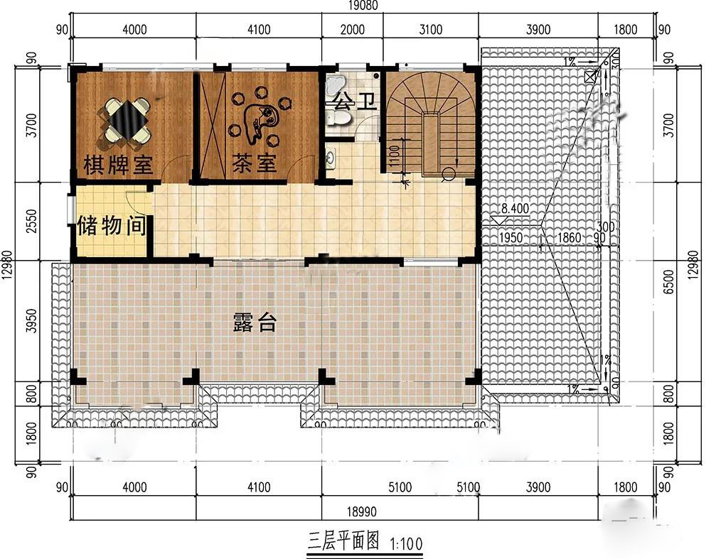 三層:棋牌室和茶室,提升家居格調(diào),在有閑情逸致時(shí),喝茶下棋,談笑風(fēng)生