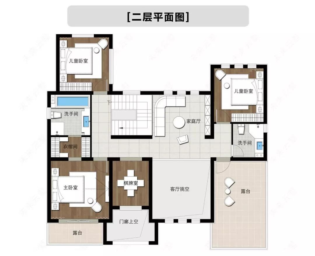 二層:家庭廳、棋牌室、主臥(帶私衛(wèi)和衣帽間)、兒童房2間、露臺、衛(wèi)生間。