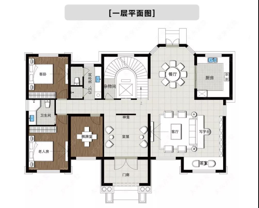 一層:門廊、堂屋、客廳、餐廳、廚房、棋牌室、老人房、臥室、衛(wèi)生間、雜物間。